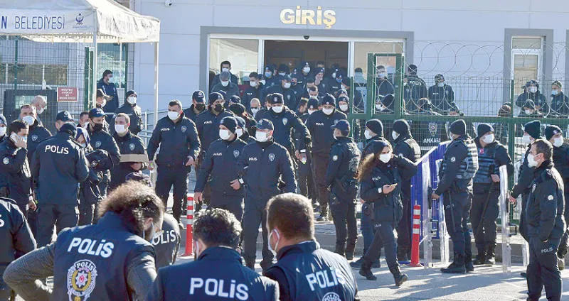 شرطة مكافحة الشغب أمام محكمة في أنقرة أمس خلال إصدار الأحكام ضد مئات المتهمين في {المحاولة الانقلابية} عام 2016 (أ.ب)