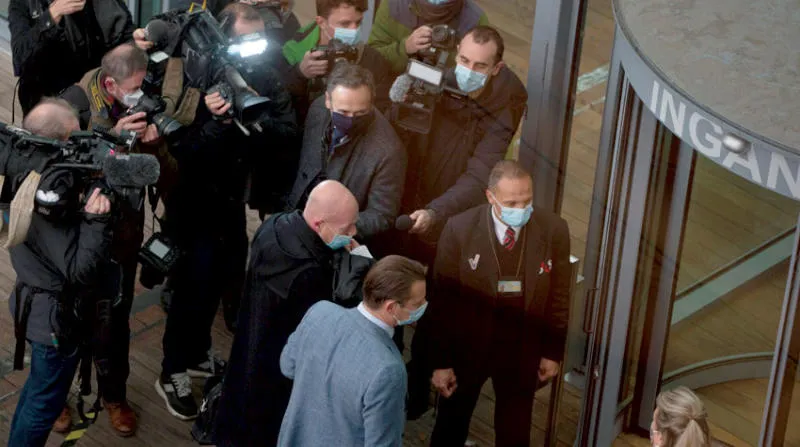 المحامي البلجيكي سفين ماري (وسط) حيث يحاكم الدبلوماسي الإيراني (أ.ب)