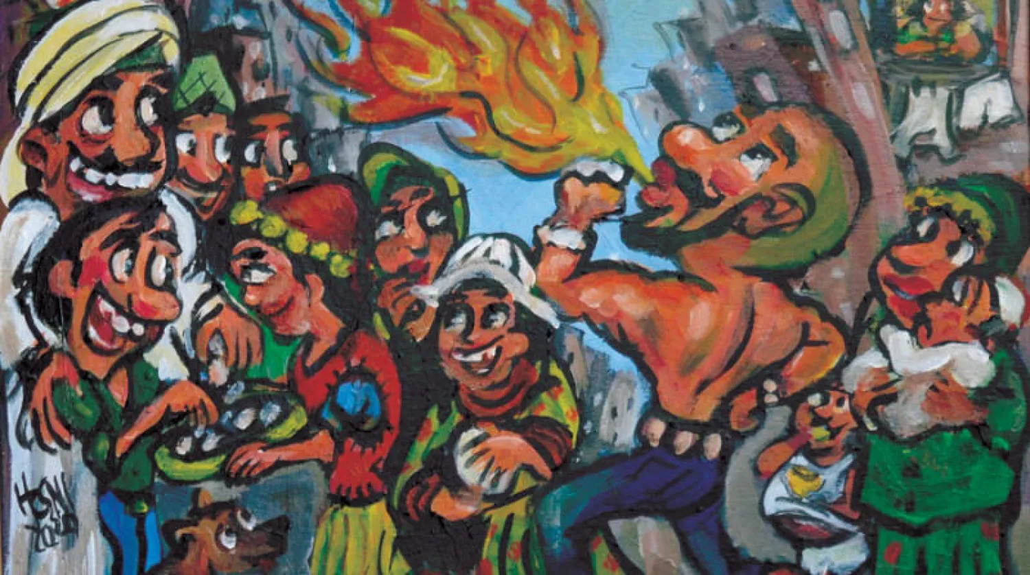 يوثق أبو بكر في اللوحة الأولى شخصية الحاوي، ذلك الشخص الذي كان يجوب الشوارع ويقوم بحركات بهلوانية وصعبة فيما يلتف الناس من حوله لمشاهدته والتصفيق له، وفي اللوحة الثانية نرى بائع حلوى غزل البنات، الذي يجوب الشوارع بمزماره الصغير ذي الصوت المميز، الذي ينطلق صوته فيهرول إليه الأطفال لشراء الحلوى.