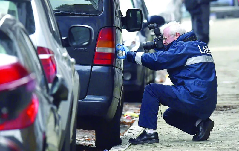 أحد رجال البحث الجنائي يفحص سيارة في مدينة فرفييه بشرق بلجيكا كانت الشرطة تبادلت النار مع ركابها أول من أمس (أ. ف.ب)