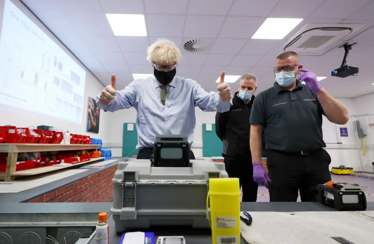 رئيس الوزراء البريطاني بوريس جونسون يزور منشأة صناعية في بولتون (رويترز)