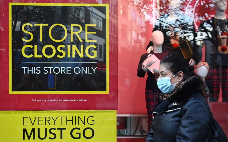امرأة ترتدي كمامة تمر أمام متجر مغلق في لندن (إ.ب.أ)