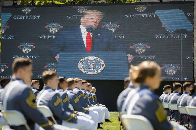 طلاب من الأكاديمية العسكرية الأميركية خلال حفل للتخرد وخلفهم صورة للرئيس دونالد ترمب على شاشة (أرشيفية - أ.ب)