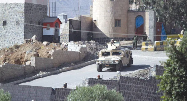 سيارة من قوات الحماية الرئاسية أمام مقر الرئيس هادي أمس (رويترز)