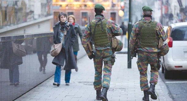 جنديان بلجيكيان يراقبان الوضع قرب مقار الاتحاد الأوروبي ببروكسل حيث كان وزراء خارجية دول الاتحاد مجتمعين أمس (ا.ب)