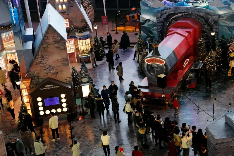 أشخاص يتجمعون داخل مجمع تسوق في بكين (رويترز)
