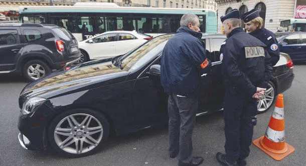 رجال شرطة فرنسيون لدى تفتيشهم إحدى السيارات في إطار الحملة الأمنية في باريس أمس (أ.ف.ب)