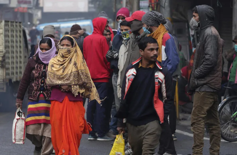 عمال ونساء يرتدون أقنعة واقية في جامو بالهند (أ.ب)