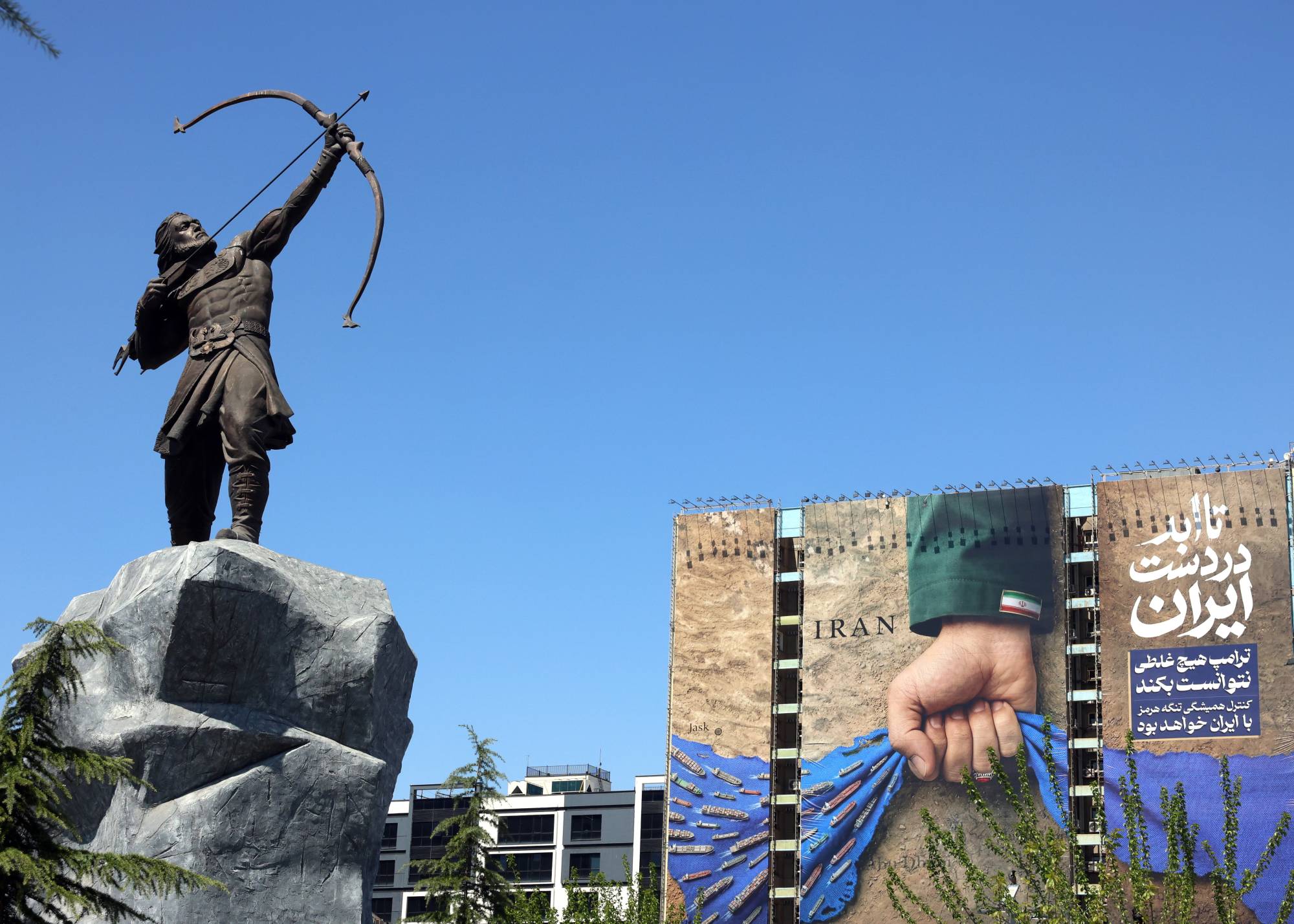 صورة دعائية تشير إلى مضيق هرمز بجوار تمثال في إحدى ساحات طهران (إ.ب.أ)