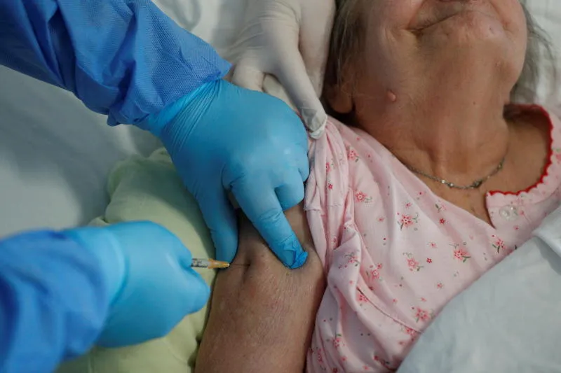 مسنّة تتلقى جرعة من لقاح «فايزر» المضاد لـ«كورونا» (رويترز)
