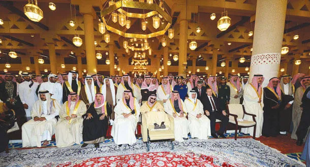خادم الحرمين الشريفين الملك سلمان بن عبد العزيز وملك البحرين وأمير الكويت وأمير دولة قطر والرئيس التركي والأمير بندر بن عبد العزيز والأمير عبد الإله بن عبد العزيز والأمير خالد الفيصل والأمير أحمد بن عبد العزيز والأمير مقرن ولي العهد السعودي قبل أداء صلاة الجنازة على جثمان الملك عبد الله بن عبد العزيز (واس)