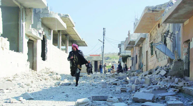 آثار الدمار التي نجمت كما يقول نشطاء بفعل قصف القوات الموالية لنظام الأسد لقرية البيرة في إدلب أمس (رويترز)