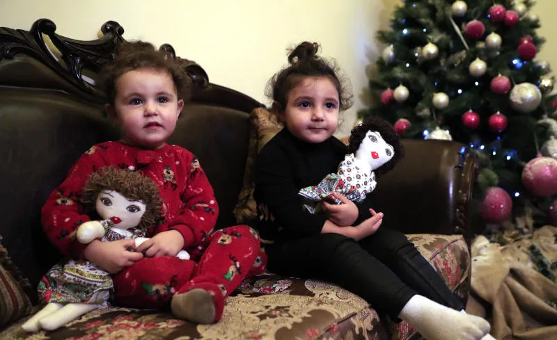 طفلتان لبنانيتان تحملان لعبتيهما بعدما تضرر منزلهما في إنفجار مرفأ بيروت (أ.ب)