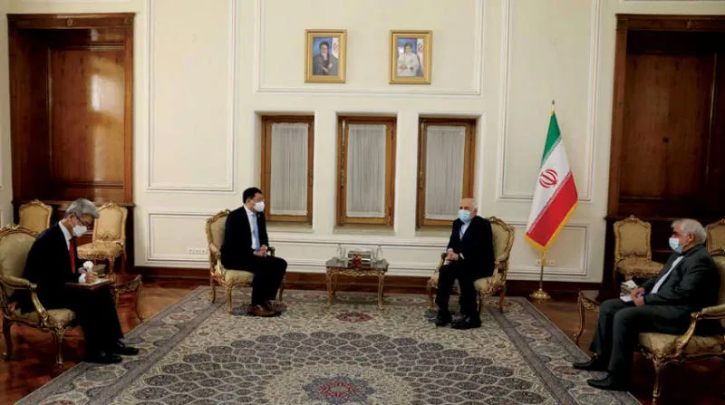 وزير الخارجية الإيراني محمد جواد ظريف يجري مباحثات مع نائب وزير الخارجية الكوري الجنوبي تشوي جونغ كون في طهران أمس (أ.ف.ب)