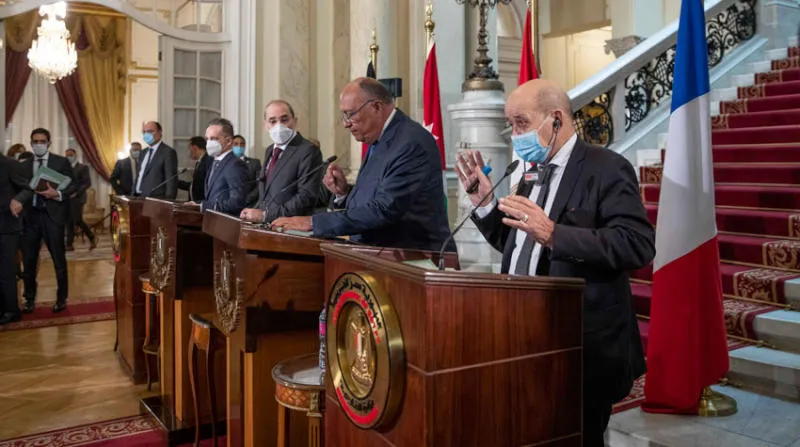 مؤتمر صحفي لوزراء خارجية فرنسا ومصر والأردن والمانيا في القاهرة الاثنين (أ.ب)