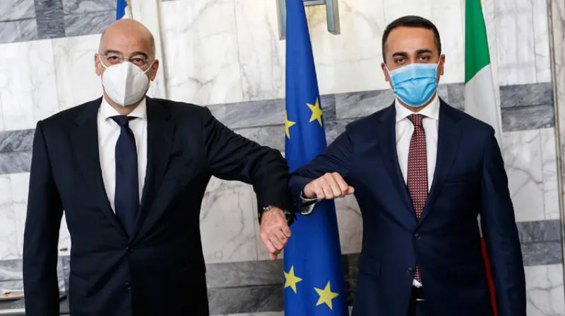 وزير الخارجية اليوناني نيكوس دندياس (يسار) مع نظيره الإيطالي لويجي دي مايو (إ.ب.أ)