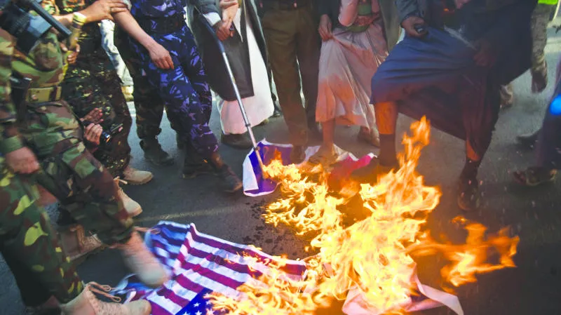 حوثيون يحرقون العلم الأميركي ويدوسون عليه أثناء مظاهرات قاموا بها الجمعة الماضي في صنعاء 2015 (أ.ب)
