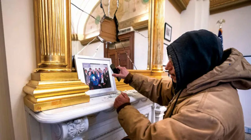 أحد المتظاهرين بعد اقتحامه مكتب بيلوسي في 6 يناير الماضي (إ.ب.أ)