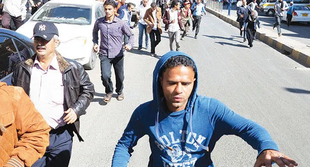 متظاهرون يمنيون يفرون بعد مطاردتهم من قبل عناصر الحوثيين في صنعاء أمس (رويترز)