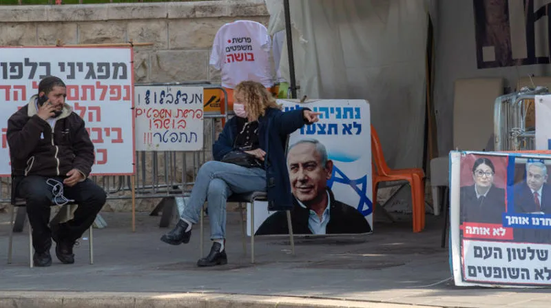 مناصرو رئيس الوزراء الإسرائيلي في خيمة تضامن دائمة أمام مقره بالقدس (إ.ب.أ)