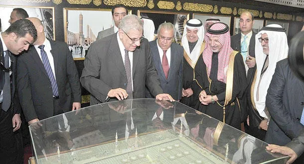 إبراهيم محلب رئيس الوزراء المصري يرافقه الدكتور جابر عصفور وزير الثقافة المصري.. والسفير أحمد بن عبد العزيز قطان السفير السعودي لدى مصر