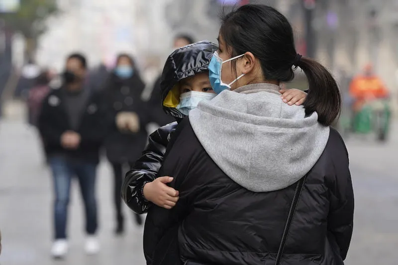طفل يرتدي قناعاً يمسك بامرأة أثناء سيرها بشارع تسوق شهير في ووهان بمقاطعة هوبي وسط الصين (أ.ب)