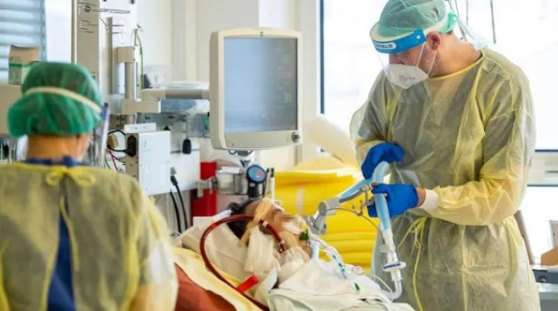 طبيب يفحص مريضاً مصاباً بفيروس كورونا داخل قسم العناية المشددة بمستشفى في ألمانيا (أ.ف.ب)