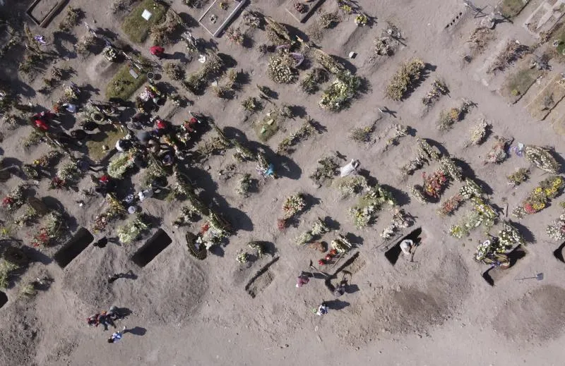 صورة جوية لعمال ينزلون نعشًا في قبر أحد ضحايا فيروس «كورونا» المستجد خلال جنازة في مقبرة بامبو أبوس في جاكرتا (أ.ف.ب)