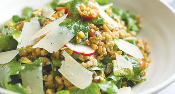 * هناك خطوتان أساسيتان للنجاح في إعداد سلطة فارو من الطراز الأول، أولهما طهي «فارو» (نوع من القمح)، مع قدر كافٍ من الملح والنباتات العطرية، بحيث يصبح لذيذ المذاق، قبل أن تمزجه بباقي المكونات. ثانيا: الاعتماد على صنف جيد للغاية من زيت الزيتون في التتبيل. وقد نجح طبق سلطة «فارو» هذا من إبداع مطعم «تشارلي بيرد» في حي سوهو، في الالتزام بهذين العنصرين. يتولى الشيف ريان هاردي طهي «فارو»، في عصير تفاح متبل بأوراق الغار والكثير من الملح، مما يكسبه مذاقا جيدا للغاية يجعل من الممكن تناوله بمفرده. إلا أن طعامه يزداد تحسنا مع إضافة الكثير من زيت الزيتون والفستق الحلبي وجبن البارميزان، مما يزيده ثراء. وقبل تقديمه، يضيف هاردي خضراوات طازجة تضم طماطم طازجة وفجلا وجرجيرا والكثير من الأعشاب. وفيما يلي وصفة إعداد واحدة من أفضل أنواع سلطة «فارو». المكونات: كوب فارو كوب عصير تفاح ملعقتان صغيرتان من الملح، ويمكن إضافة المزيد حسب الرغبة ورقتا غار 8 ملاعق طعام زيت زيتون بكر ملعقتا طعام عصير ليمون طازج 70 غراما من جبن البارميزان، مقطعة باستخدام سكين تقشير الخضراوات (نصف كوب) 70 غراما من الفستق الحلبي المقطع كوبان من أوراق الجرجير كوب من أوراق البقدونس أو الريحان، مقطعة كوب أوراق نعناع 3/4 كوب من الطماطم الصغيرة المقطعة لنصفين 1/3 كوب من فجل مقطع لشرائح رفيعة ملح الإعداد: في قدر صغير، ضع «الفارو» وعصير التفاح والملح وأوراق الغار وكوبي ماء واتركه حتى يغلي. استمر في الغلي حتى يصبح قوام «الفارو» طريا ويتبخر السائل، مما يستغرق نحو 30 دقيقة. إذا تبخر السائل بأكمله قبل أن ينضج «الفارو»، أضف قليلا من الماء الإضافي. بعد ذلك، اترك «الفرو» ليبرد، ثم تخلص من أوراق الغار. في إناء السلطة، امزج زيت الزيتون وعصير الليمون وبعض الملح. أضف «الفارو» والجبن والفستق الحلبي واخلطهم جيدا. احتفظ بالمزيج لمدة 4 ساعات في درجة حرارة الغرفة، أو ضعه في المبرد ليلا (لكن احرص على عودته لدرجة حرارة الغرفة قبل تقديمه). قبيل التقديم، أضف الجرجير والأعشاب والطماطم والفجل والملح.