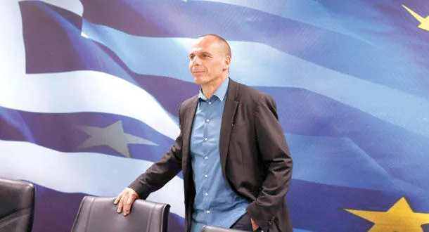 وزير المالية اليوناني يانيس فاروفاكيس خلال المؤتمر الصحافي في أثينا أمس (رويترز)