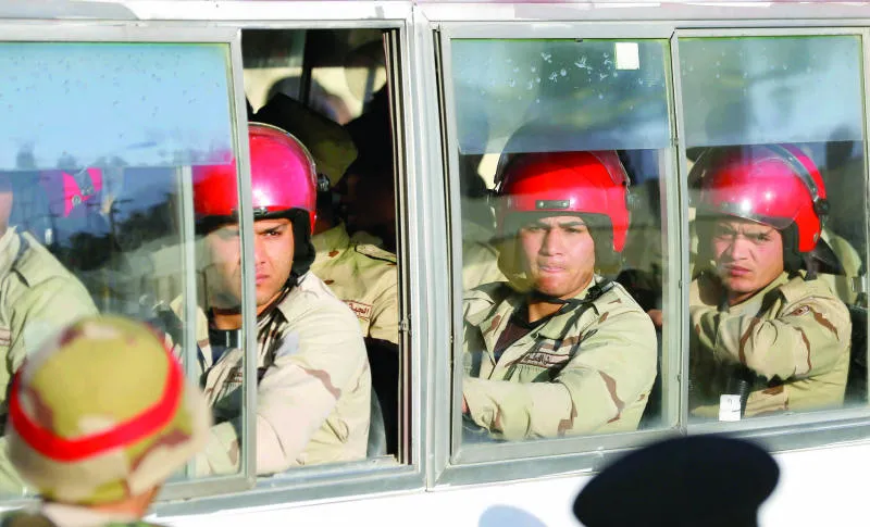 جنود الشرطة العسكرية يصلون إلى مطار ألماظة العسكري قبل وصول جثامين قتلى تفجيرات وهجمات وقعت الليلة قبل الماضية في شبه جزيرة سيناء (أ.ب)