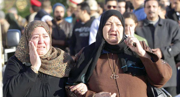 دموع وأحزان عائلات ضحايا التفجيرات الإرهابية في سيناء لحظة خروج جثامين ذويهم أمس (إ.ب.أ)