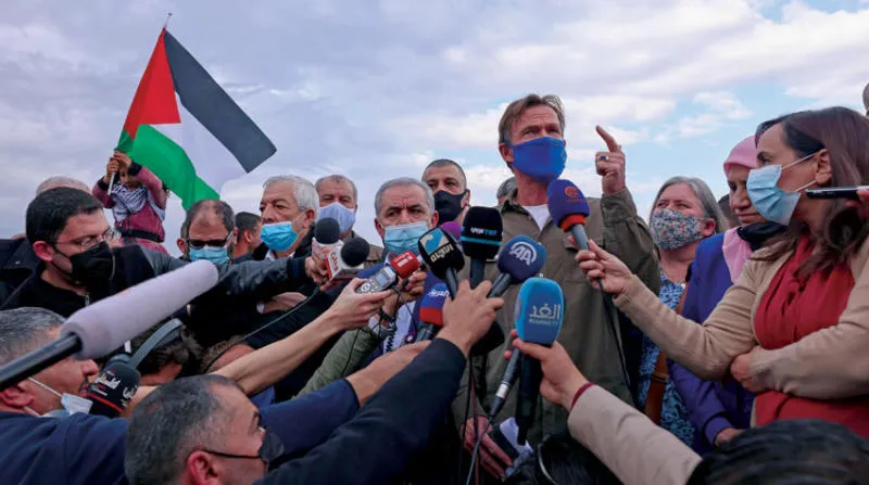 ممثل الاتحاد الأوربي في الأراضي الفلسطينية يتحدث تضامنا مع أهالي حمصة الفوقا بحضور محمد اشتية (أ.ف.ب)