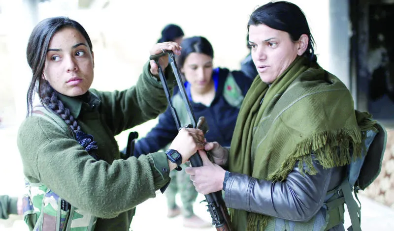 دورية نسائية مقاتلة لوحدات الدفاع الكردية في كوباني التي تقع على مقربة من الحدود السورية تستعد للخروج من المنطقة أمس بعد انسحاب «داعش» (إ.ب.أ)