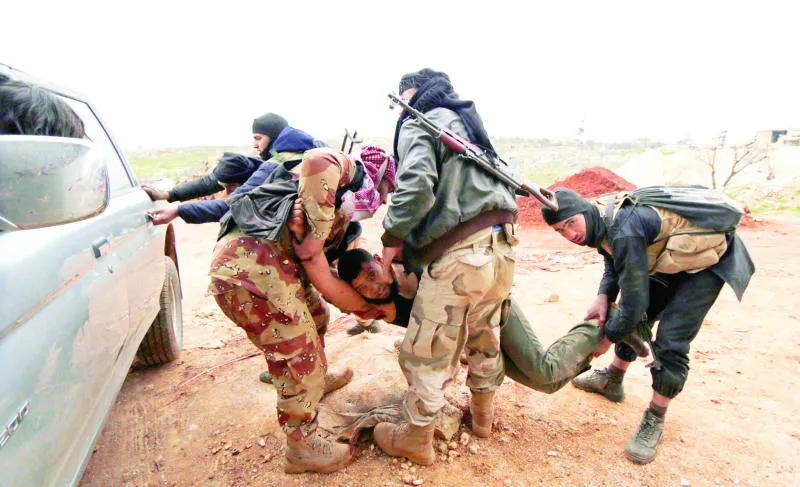 مقاتلون من لواء «صقور الشام» التابع للجيش السوري الحر يحملون أحد جرحى اللواء بعد إصابته في اشتباكات مع قوات النظام في المنطقة الجبلية بغرب إدلب (رويترز)