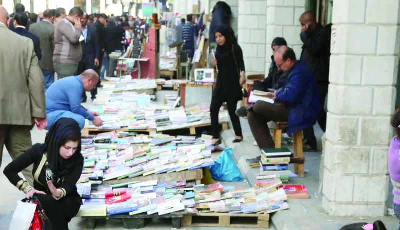 عراقيون يعاينون كتبا على رصيف شارع المتنبي في بغداد (أ.ب)