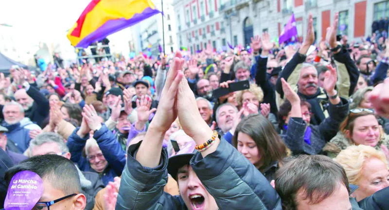 خرج عشرات الآلاف إلى الشوارع في العاصمة الإسبانية مدريد أمس دعما لحزب «بوديمaوس» المناهض للتقشف. وردد الكثيرون منهم هتافات «نعم نستطيع» بينما كانوا يتوجهون من مبنى البلدية في مدريد إلى ساحة بورتا ديل سول وسط المدينة. وكان بعضهم يحمل لافتات كتب عليها «حان وقت التغيير».