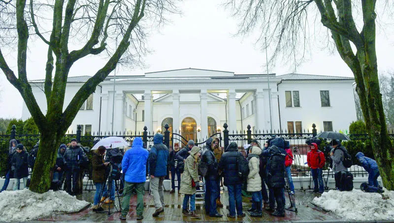 صحافيون ينتظرون خارج القصر الرئاسي في مينسك حيث انطلقت محادثات السلام بين الأطراف المعنية بالأزمة الأوكرانية أمس (أ.ف.ب)