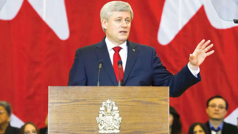 ستيفن هاربر رئيس الوزراء الكندي يتحدث في مؤتمر صحافي عن مشروع قانون مكافحة الإرهاب الجديد أمس (رويترز)