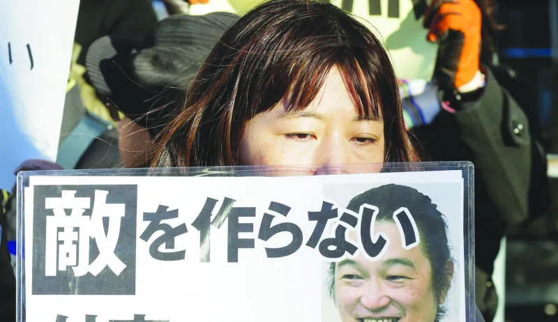 يابانية تحمل صورة الرهينة كينجي غوو الذي أعدمه «داعش» أمس وسط موجة استياء وغضب من قبل المجتمع الدولي (إ.ب.أ)