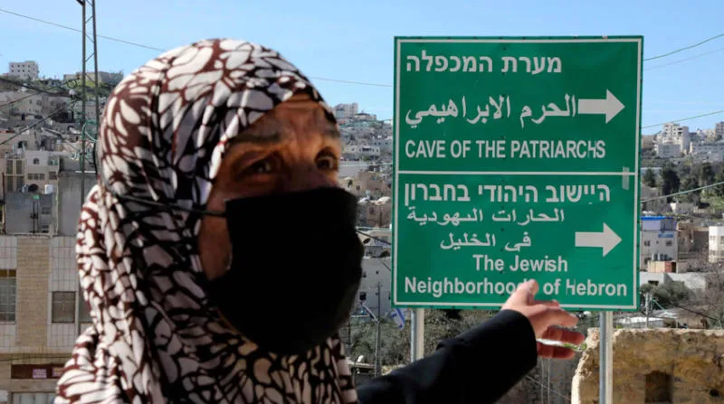 لافتة رفعت حديثاً توضح اتجاهين أحدهما للمستوطنات اليهودية في الخليل والآخر للحرم الإبراهيمي (أ.ف.ب)
