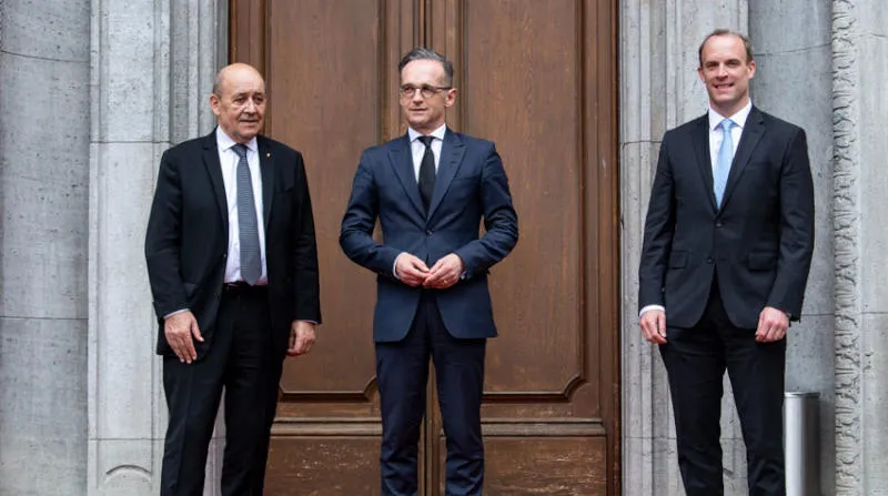 وزير الخارجية الألماني هايكو ماس يتوسط نظيره الفرنسي جان إيف لودريان والبريطاني دومينيك راب خلال اجتماع حول إيران، في يونيو الماضي (إ.ب.أ)