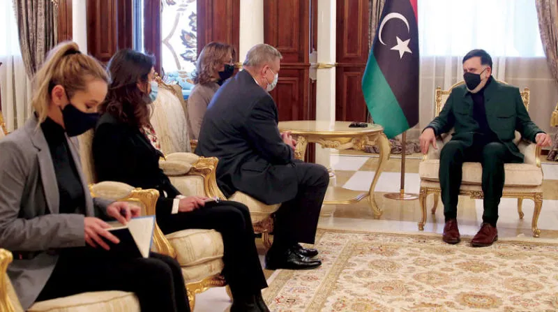 جانب من لقاء السراج ودبيبة في طرابلس أمس (أ.ف.ب)