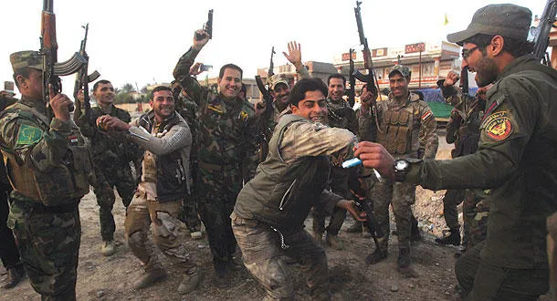 صورة بثت أمس لعناصر في الحشد الشعبي وهم يحتفلون بعد استعادتهم منطقة المنصورية في محافظة ديالى من «داعش» أول من أمس (أ.ف.ب)