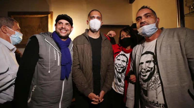 الصحفي خالد درارني يتوسط أنصاره لحظة خروجه من السجن (إ.ب.أ)