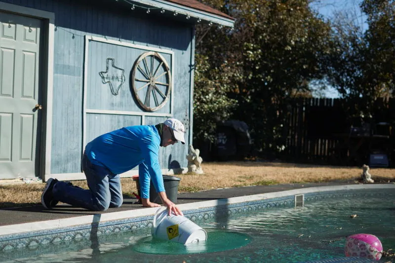 أميركي يملأ دلواً بالماء من حمام السباحة الخاص به في تكساس قبل عودة المياه (رويترز)