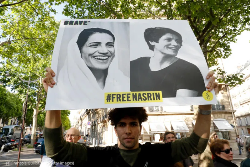 متظاهر يطالب بالإفراج عن المحامية الإيرانية نسرين سوتوده في مظاهرة أمام السفارة الإيرانية في فرنسا في 13 يونيو 2019 (أرشيفية - أ.ف.ب)