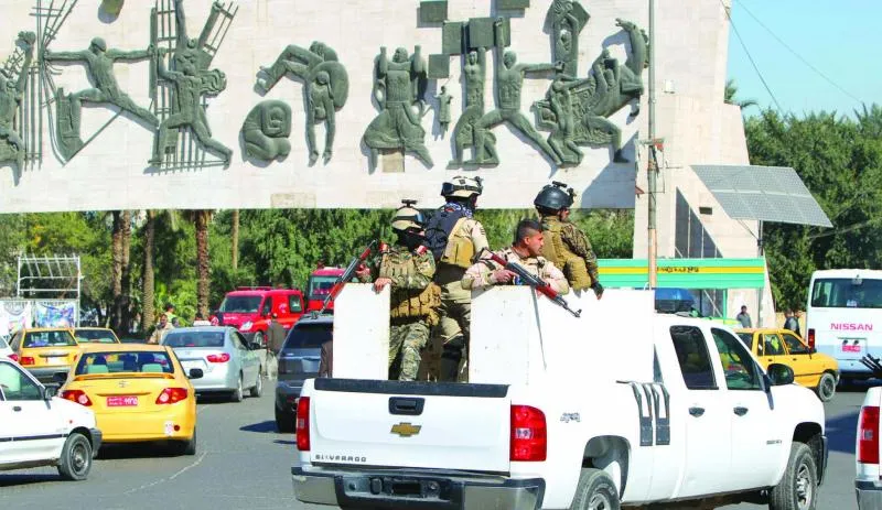 دورية أمنية عراقية مسلحة في ساحة التحرير وسط بغداد حيث أمر رئيس الوزراء العراقي بمنع هذه المظاهر أمس (أ.ف.ب)