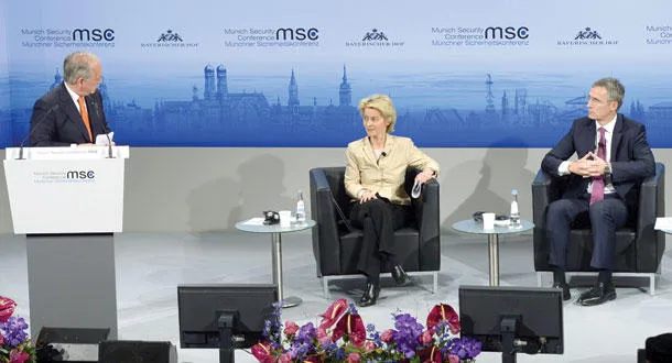 رئيس المؤتمر فولفغانغ إيشنغر يتحدث في الجلسة الافتتاحية بحضور وزيرة الدفاع الألمانية والأمين العام لحلف شمال الأطلسي في ميونيخ أمس (ا.ف.ب)