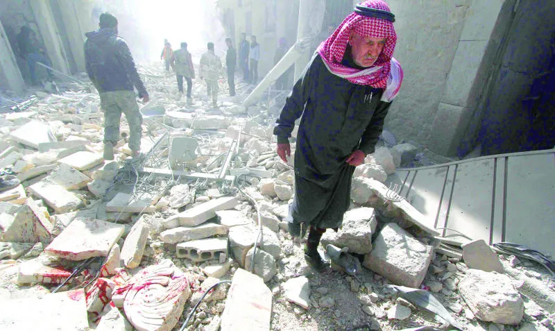 سوريون يمشون وسط الدمار الذي خلفه قصف البراميل المتفجرة من قبل النظام في حلب أمس (رويترز)